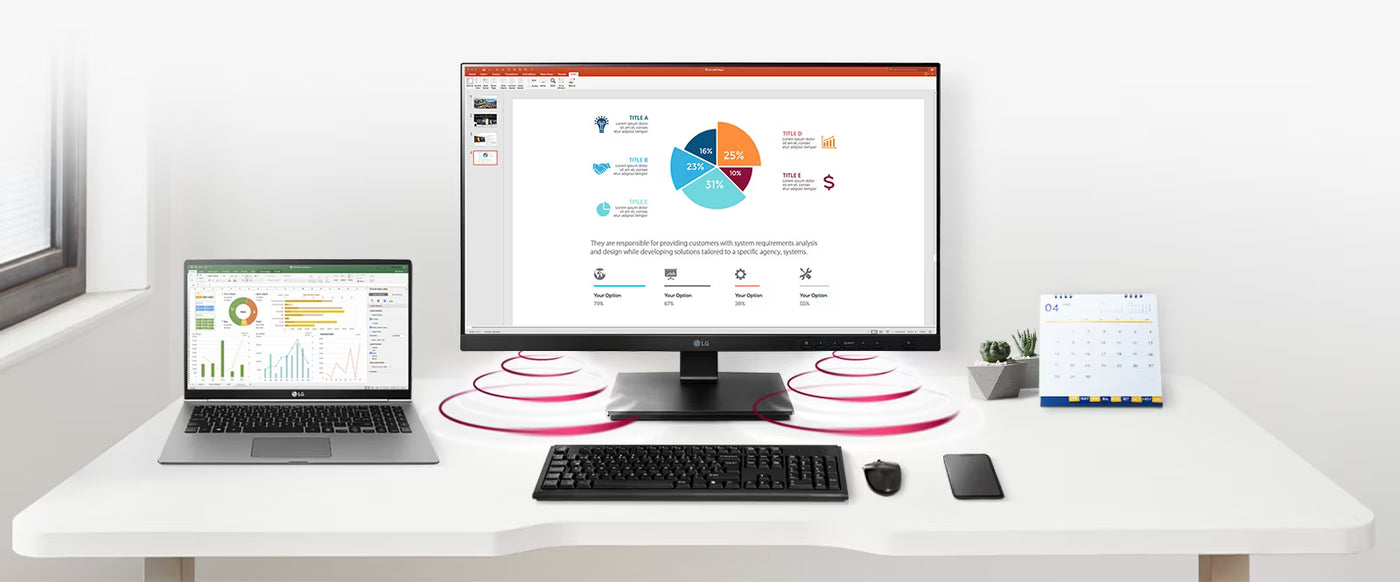 Az LG BN és BL szériás üzleti monitorjai beépített Maxxaudio hangszórói tiszta hangzást biztosítvanak, így nincs szükséged külső hangszórókra és egyéb hangeszközökre. Több hely marad az asztalon kedvenc cuccaidnak és megmarad a letisztult környezet.