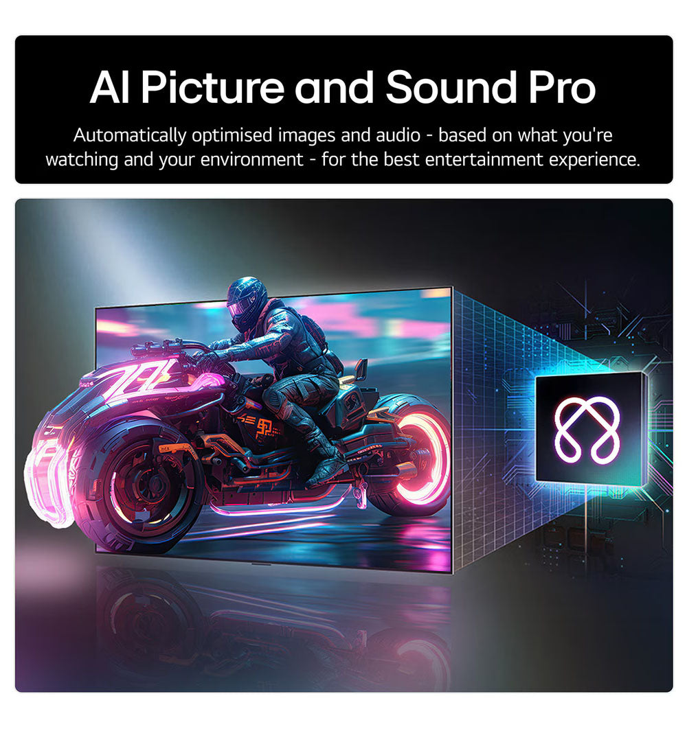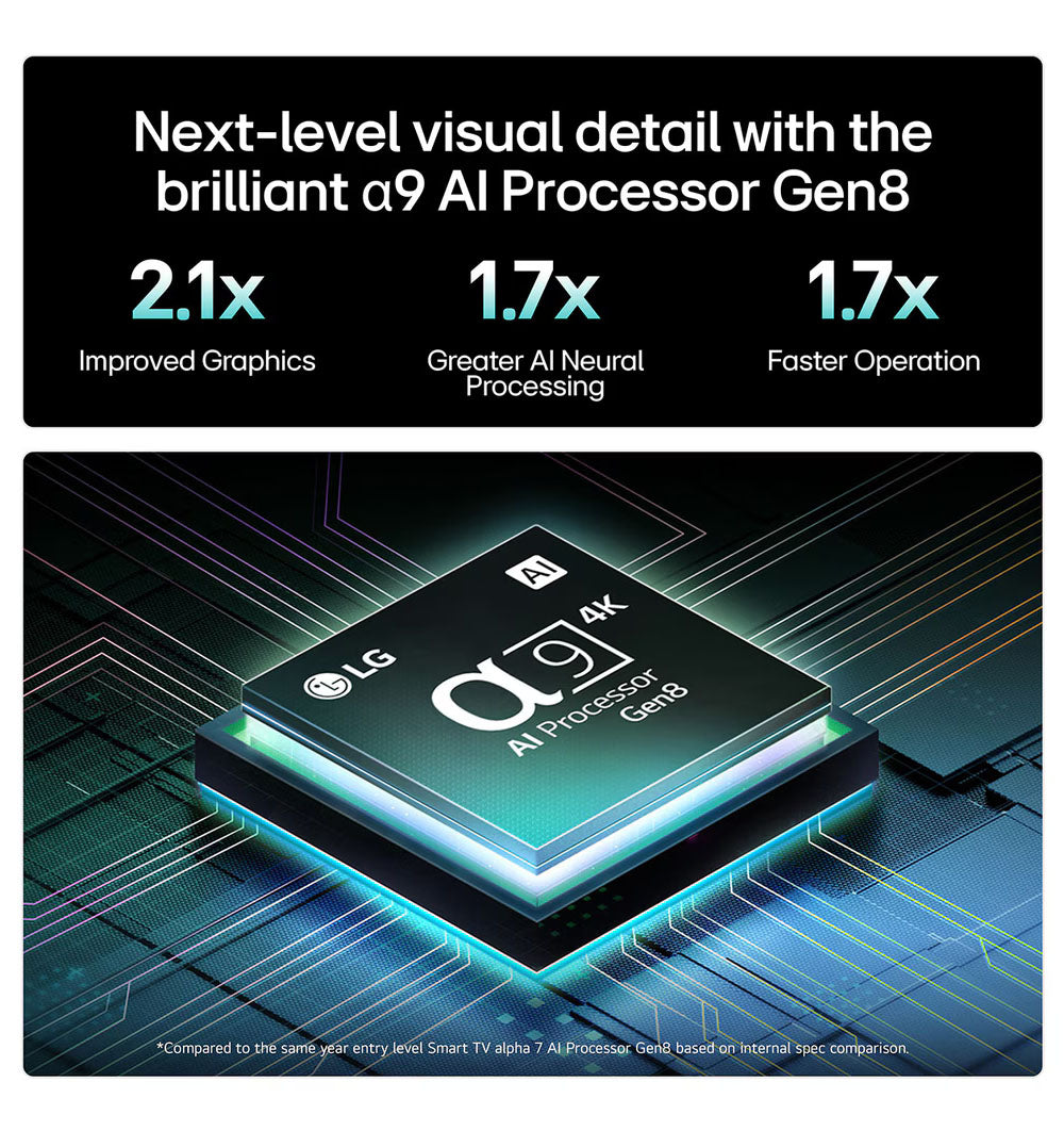 Fejlett mélytanuló algoritmusok, finomhangolt képkockák és hangoptimalizálás, precíz 4K felskálázással intelligens funkciókkal és élsimítással ellátva. Ezekben jeleskedik igazán az LG által tökéletesített erőteljes 8. Generációs Alpha 9 AI processzora. Élvezd az elsöprő sebességet már az első használattól kezdve, egészen az extra gaming módokig!