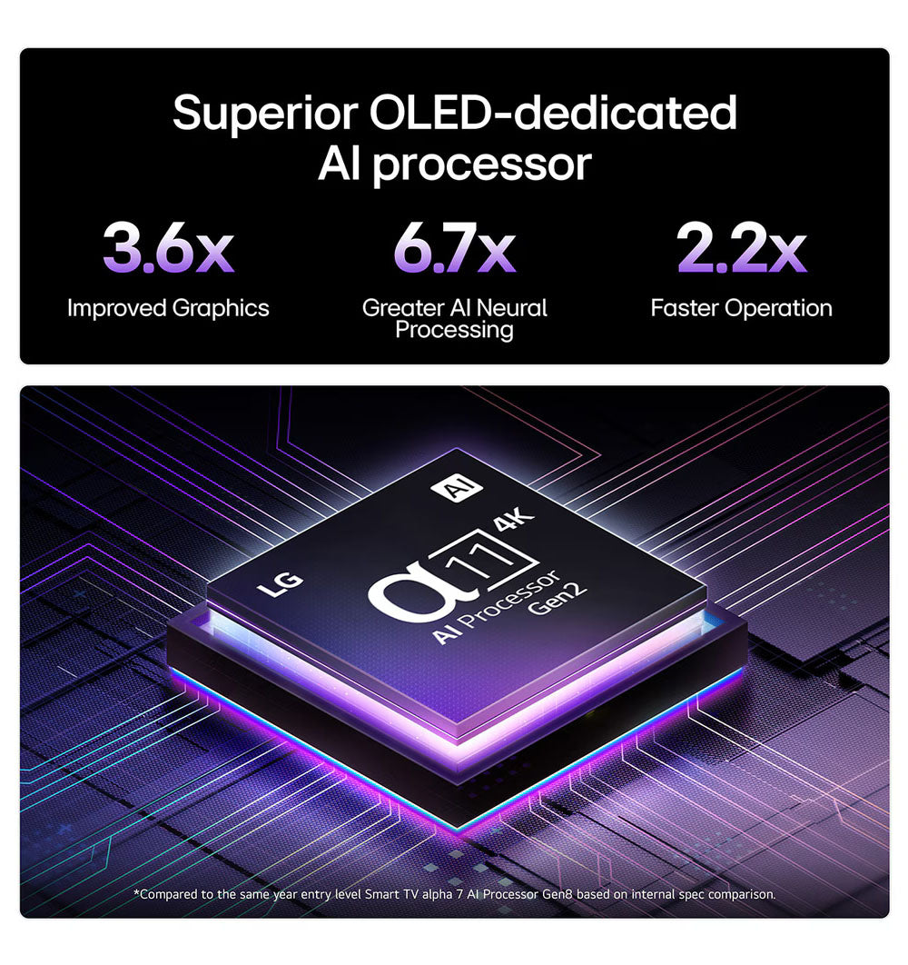 A tavaly megjelent Alpha 11 AI processzor még erősebb 2. genercáiós változata került a G5-ös oledek szívébe, ami a hagyományos smart televíziókhoz képest akár 3x gyorsabb működést és 6x hatékonyabb neurális feldolgozást képes kipréselni magából. Ezzel még dinamikusabbá téve a HDR tartalmakat, ahol a megújult Brightness Booster Max technológia közreműködésével elérheti a lehetetlennek tűnő 4000 Nits fényerőt is.
