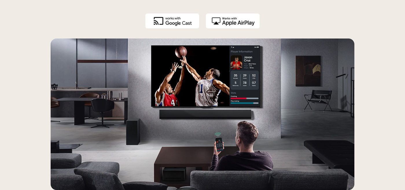 Egy sokoldalú csúcs Smart televízióhoz méltóan nem hiányozhatnak a képernyőmegosztás és tükrözést segítő funkciók sem, így az LG WebOS 25 szoftverével igényedre szabva, egyszerűen és gyorsan párosíthatod Androidos és Apple cuccaidat is. Az Apple Airplay 2.0 és Google Cast támogatás és a szokásos Screen Share megoldások Bluetooth csatlakozással azonnal elérhetőek.
