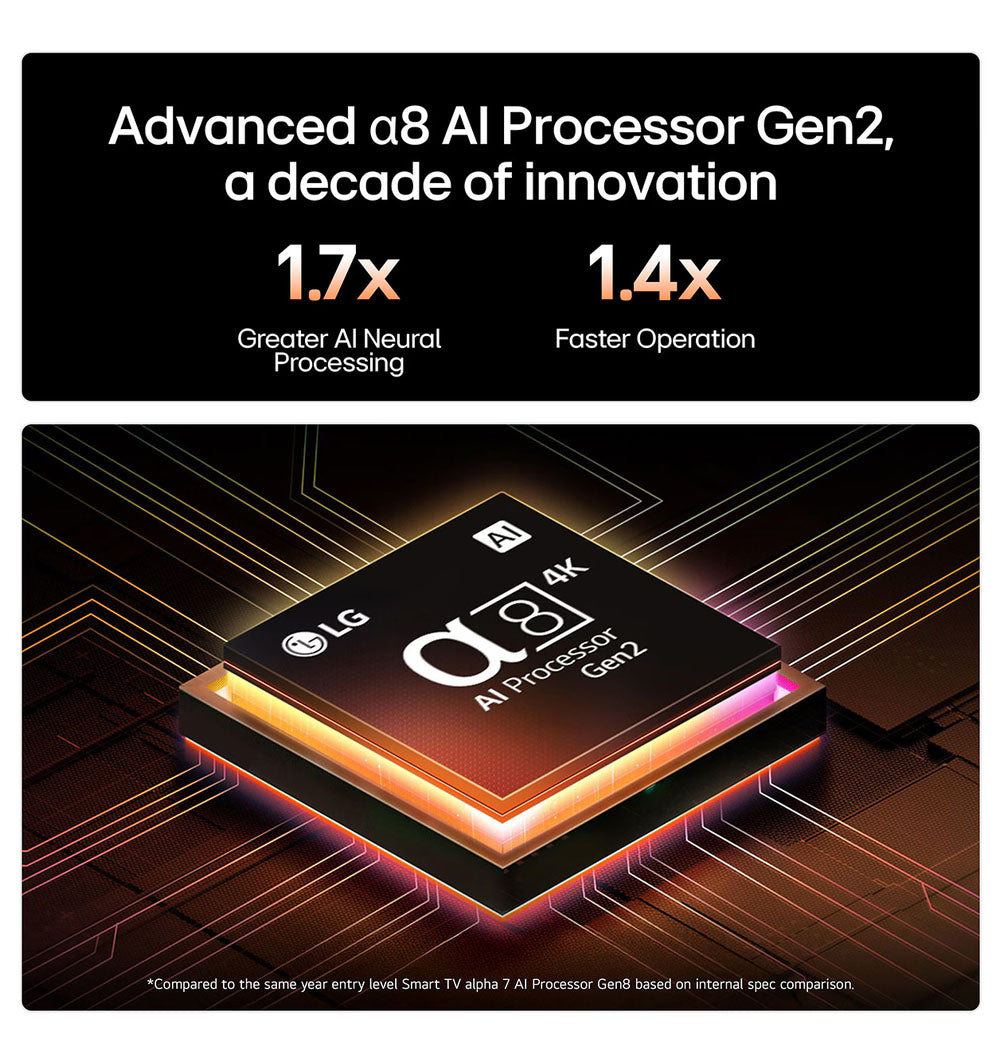 Fejlett mélytanuló algoritmusok, finomhangolt képkockák és hangoptimalizálás, precíz 4K felskálázással intelligens funkciókkal és élsimítással ellátva. Ezekben jeleskedik igazán az LG által tökéletesített erőteljes 2. Generációs Alpha 8 AI processzora. Élvezd az elsöprő sebességet már az első használattól kezdve, egészen az extra gaming módokig!